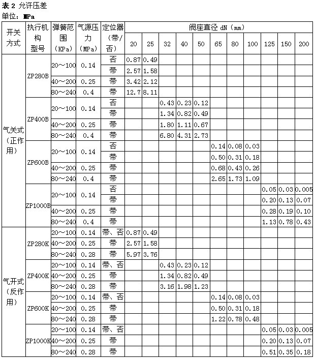 Note 1) For ZXSW type single-seat bellows sealed control valve, the large allowable pressure difference is 1.0MPa, if the value in the table is less than 1.0MPa, it remains unchanged, and if the value is greater than 1.0MPa, the value is 1.0MPa.